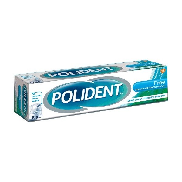 Aiuta a prevenire le infiltrazioni di cibo fra la gengiva e la protesi. Senza coloranti e conservanti. Senza aromi artificiali. Formulazione senza zinco. Polident Free fa parte della gamma di adesivi per protesi Polident senza sapore e privi di coloranti artificiali ed è formulato per offrire tenuta per tutto il giorno e un gusto neutro che non interferisce con il sapore dei cibi. La formulazione è inoltre priva di zinco. Anche se aderisce bene, la protesi può permettere infiltrazioni di cibo e provocare disagio. L'azione provata di Polident Free contribuisce a ostacolare queste infiltrazioni.
